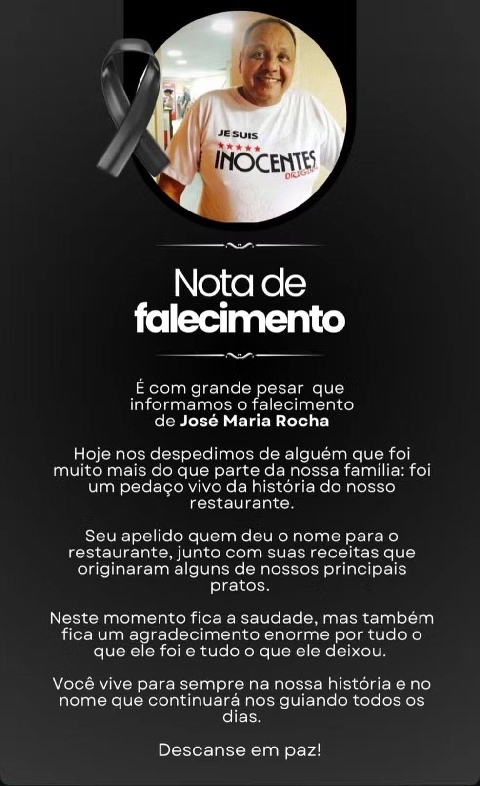 “É com grande pesar que informamos o falecimento de José Maria Rocha.