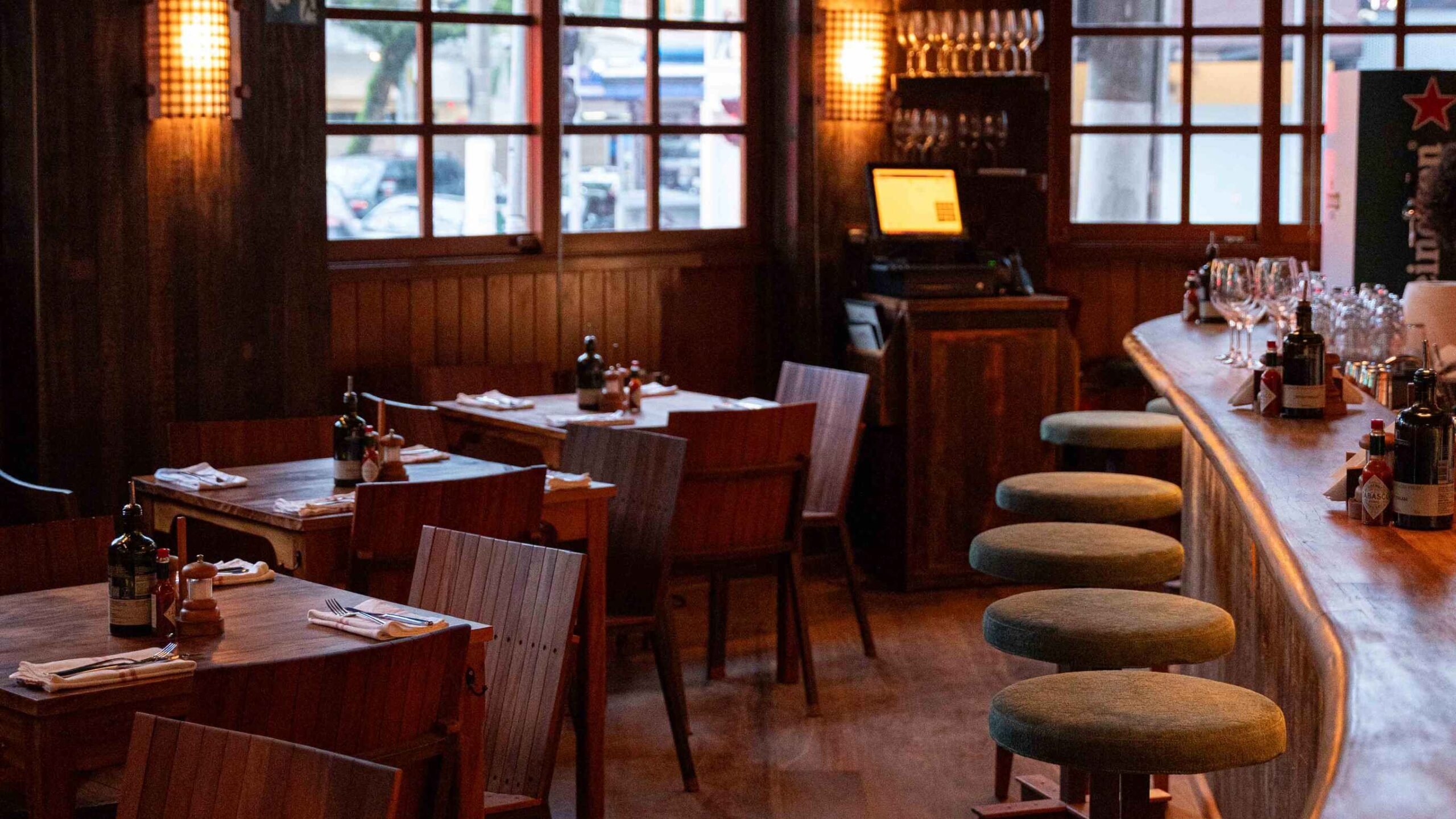 O salão, com janelões abertos, azulejos e um grande balcão, reforça o clima acolhedor e descomplicado.